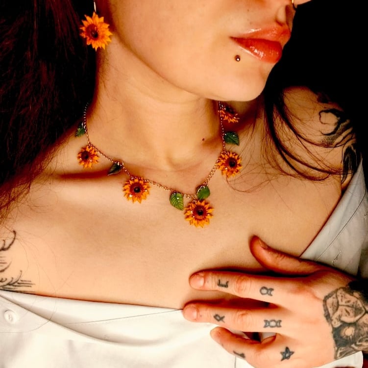 Delikatny, a jednocześnie wyrazisty - jak złote światło późnego lata zatrzymane tuż przy obojczyku. Słoneczniki i zielone listki tworzą lekką, botaniczną kompozycję inspirowaną łąką w pełnym słońcu 🌿